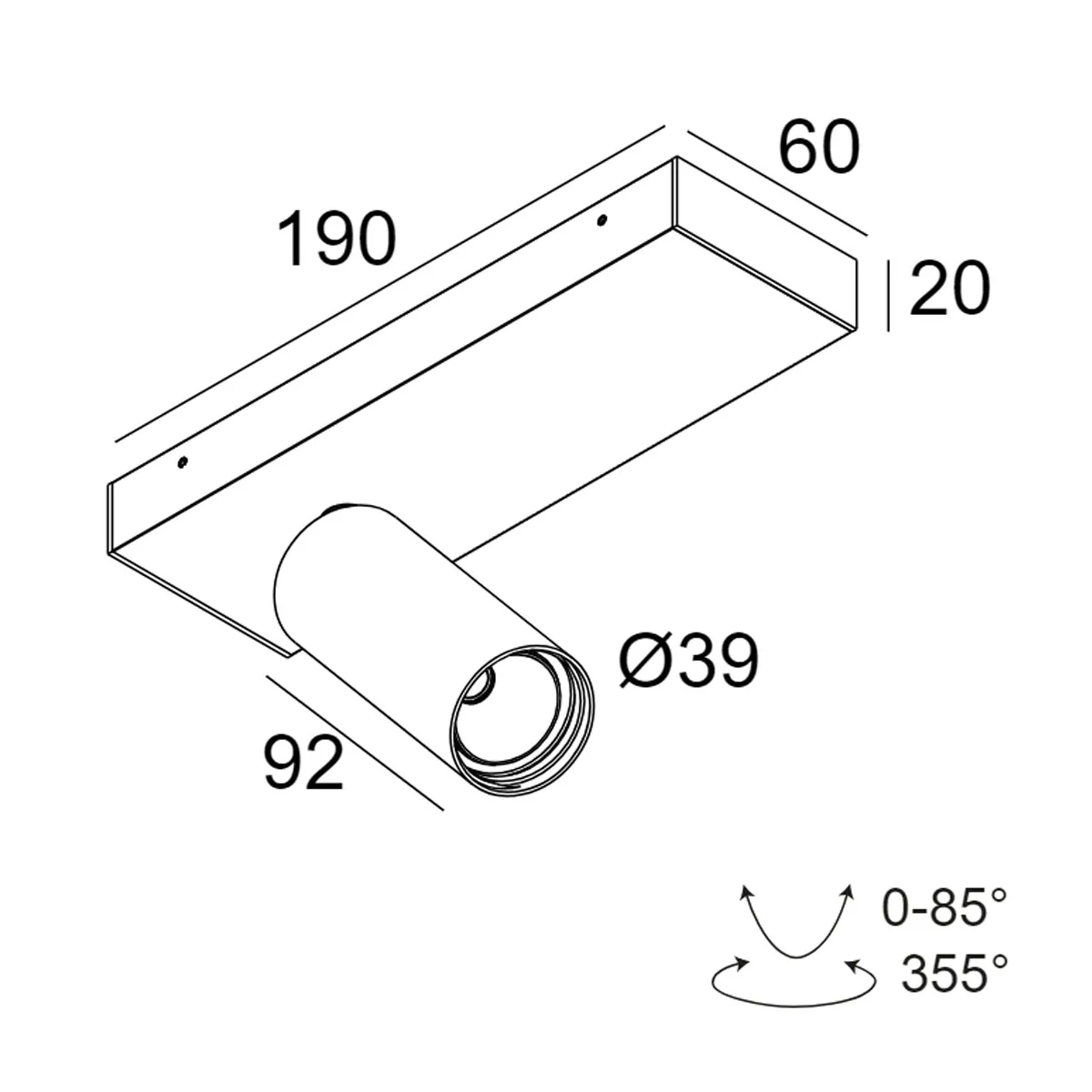 | Abmessungen: | L: 19 cm, B: 6 cm, H: 2 cm, Leuchtenkopf: Ø: 3,9 cm, L: 9,2 cm |