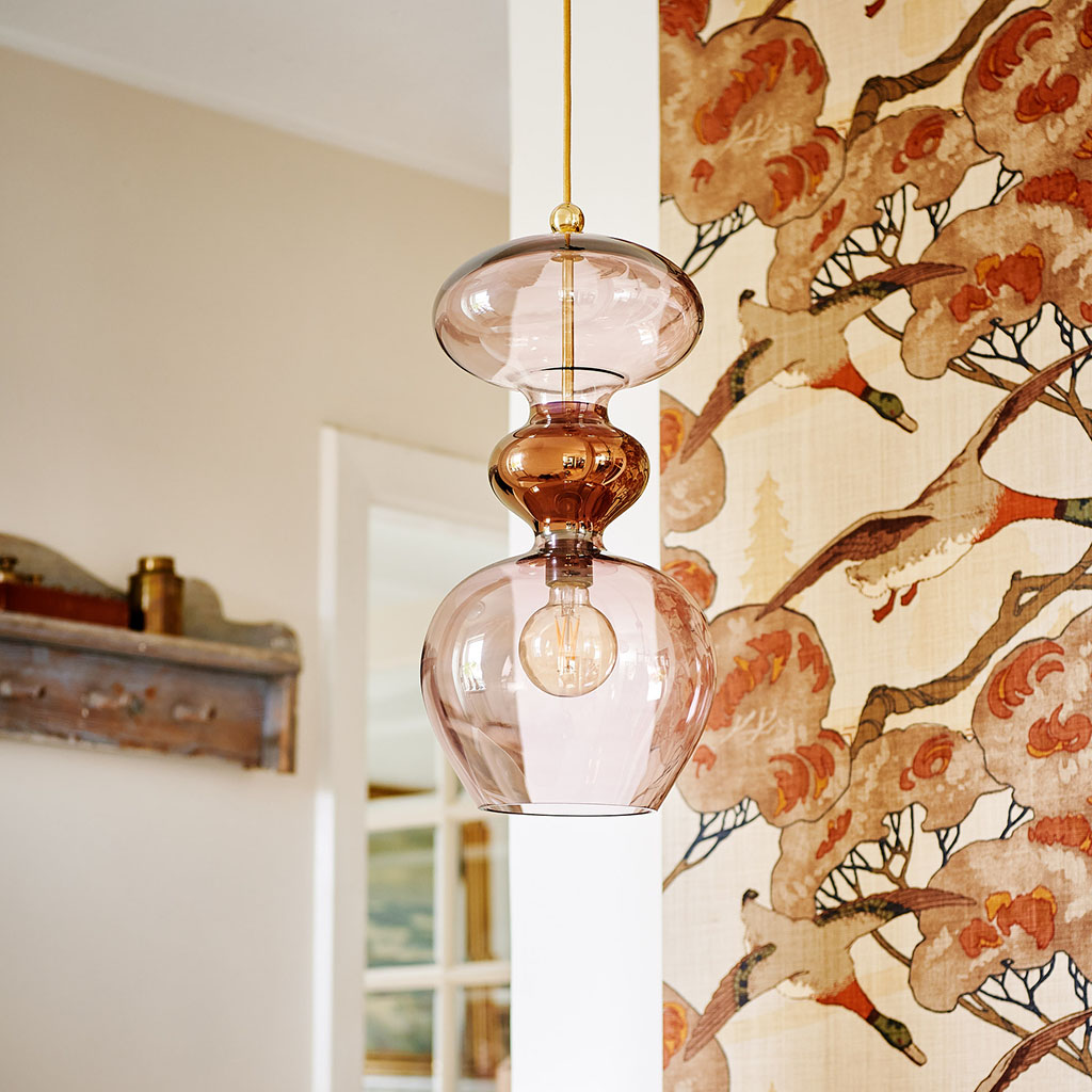 Die schmale Pendelleuchte Futura von Ebb & Flow formt das Glas entlang dreier Kurven mit wechselnden Farben, Metall im Mittelteil und tonaler Farbgebung im oberen und unteren Teil. Durch ihre schmale Form passt sie sich an verschiedene Umgebungen an. Ist in verschiedenen Glasfarben erhältlich.