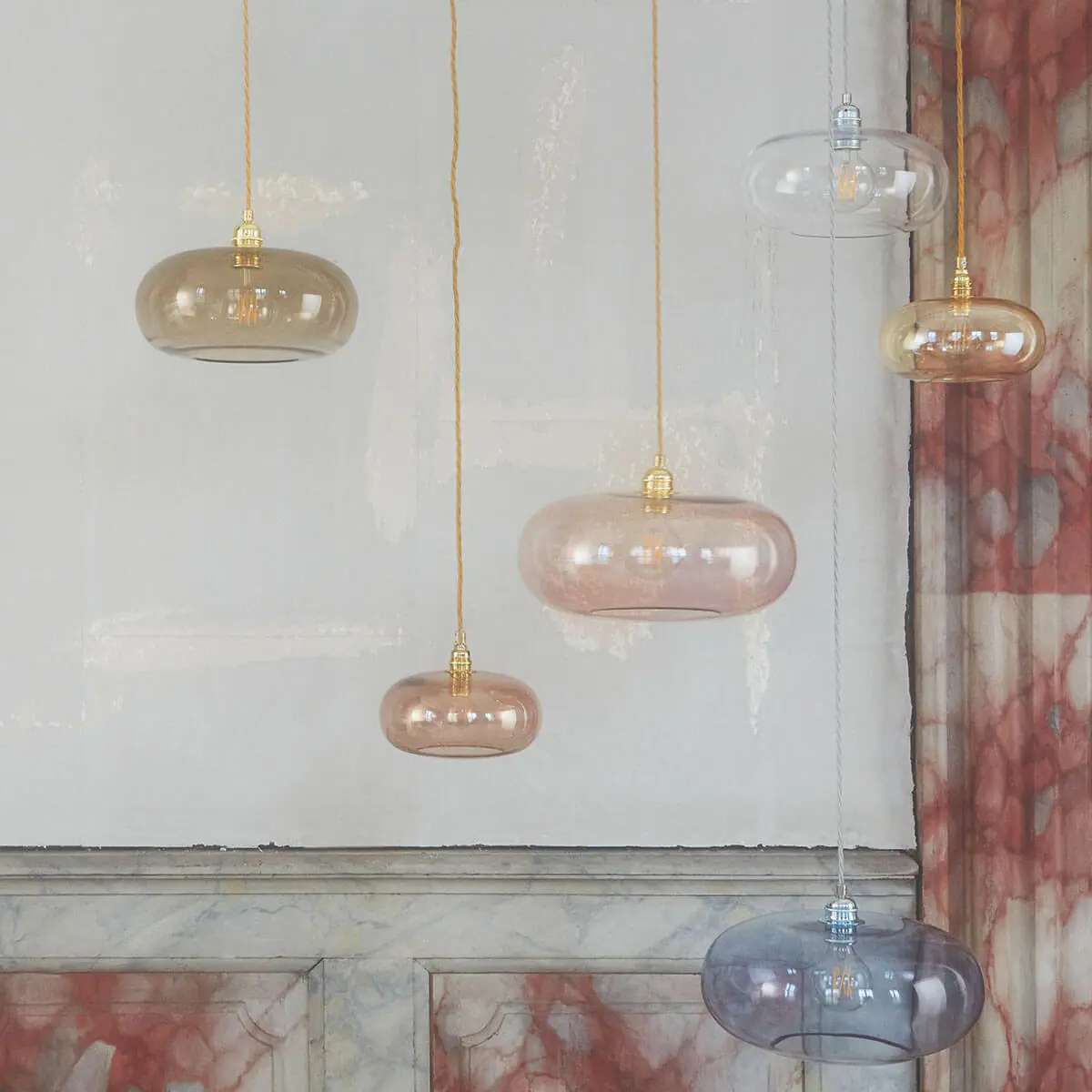 Ebb & Flow Glas Pendelleuchte Horizon verbindet modernes skandinavisches Design mit der handwerklichen Perfektion. Die Leuchte besteht aus mundgeblasenem Glas, aus einer silbernen oder goldenen Metallstruktur und einem ummantelten Textilkabel. Durch ihre schlichte Form und warmem Leuchten lässt sich diese Leuchte in viele Wohnstile integrieren. Als besonderes Stilelement empfehlen sich passende dekorative Filament- oder Retrofit Glühbirnen, die in unserem Shop über das Zubehör erhältlich sind.