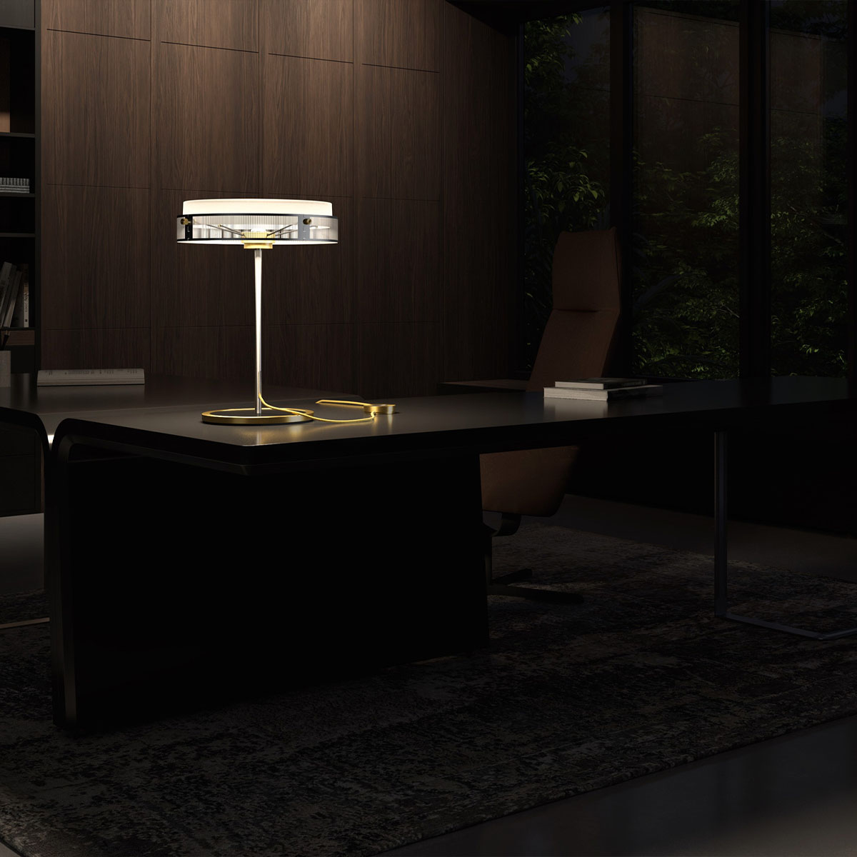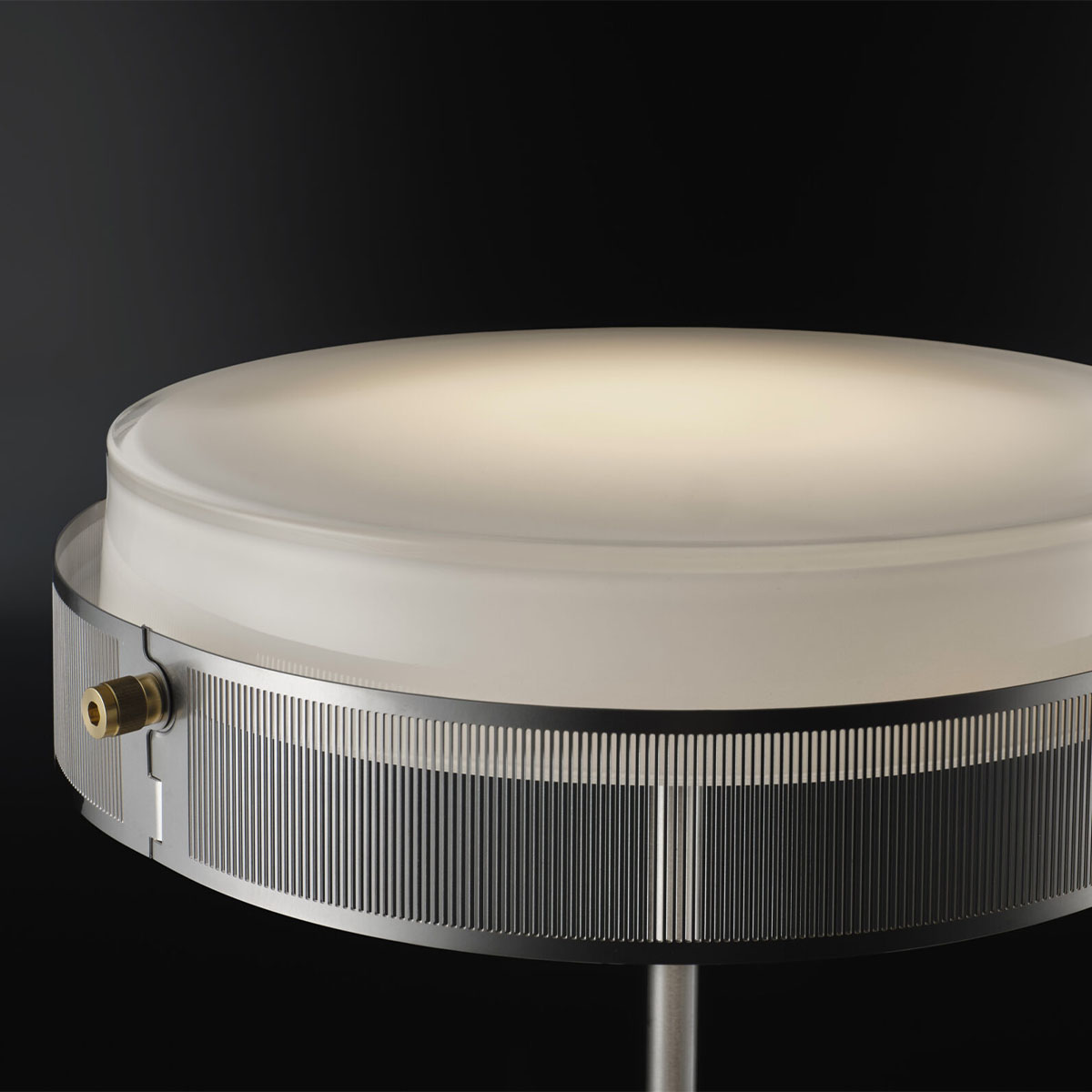Anima, die erste Zusammenarbeit mit dem renommierten Architekten Jean-Michel Wilmotte, präsentiert eine moderne Interpretation der klassischen Abat-Jour-Tischleuchte. Dieser zeitlose Klassiker wurde überarbeitet und aktualisiert. Anima besticht durch die Verwendung verschiedener Materialien und Verfahren, die ihre Einzigartigkeit unterstreichen. Der Hauptkörper besteht aus gedrehtem Aluminium und beherbergt ein LED-Modul mit spezieller Optik. Das Opalglas sorgt für eine sanfte Streuung und Reflexion des Lichts, wodurch eine angenehme Atmosphäre entsteht. Der äußere Rahmen besteht aus vier Elementen aus fotogeätztem Edelstahl, während der Stiel aus gebürstetem Edelstahl das farbige Stoffkabel beherbergt. Der Sockel aus transparentem Glas wird von einem farbigen Metallring umrahmt, was ein harmonisches Gesamtbild schafft. Kein Detail wurde dem Zufall überlassen: Der spezielle Dimmer aus gedrehtem Aluminium passt perfekt zur Metalloberfläche der Leuchte. Das Ergebnis ist ein einzigartiges Produkt, das das Design eines renommierten Architekten mit der Qualität und der Liebe zum Detail von Lumina verbindet.