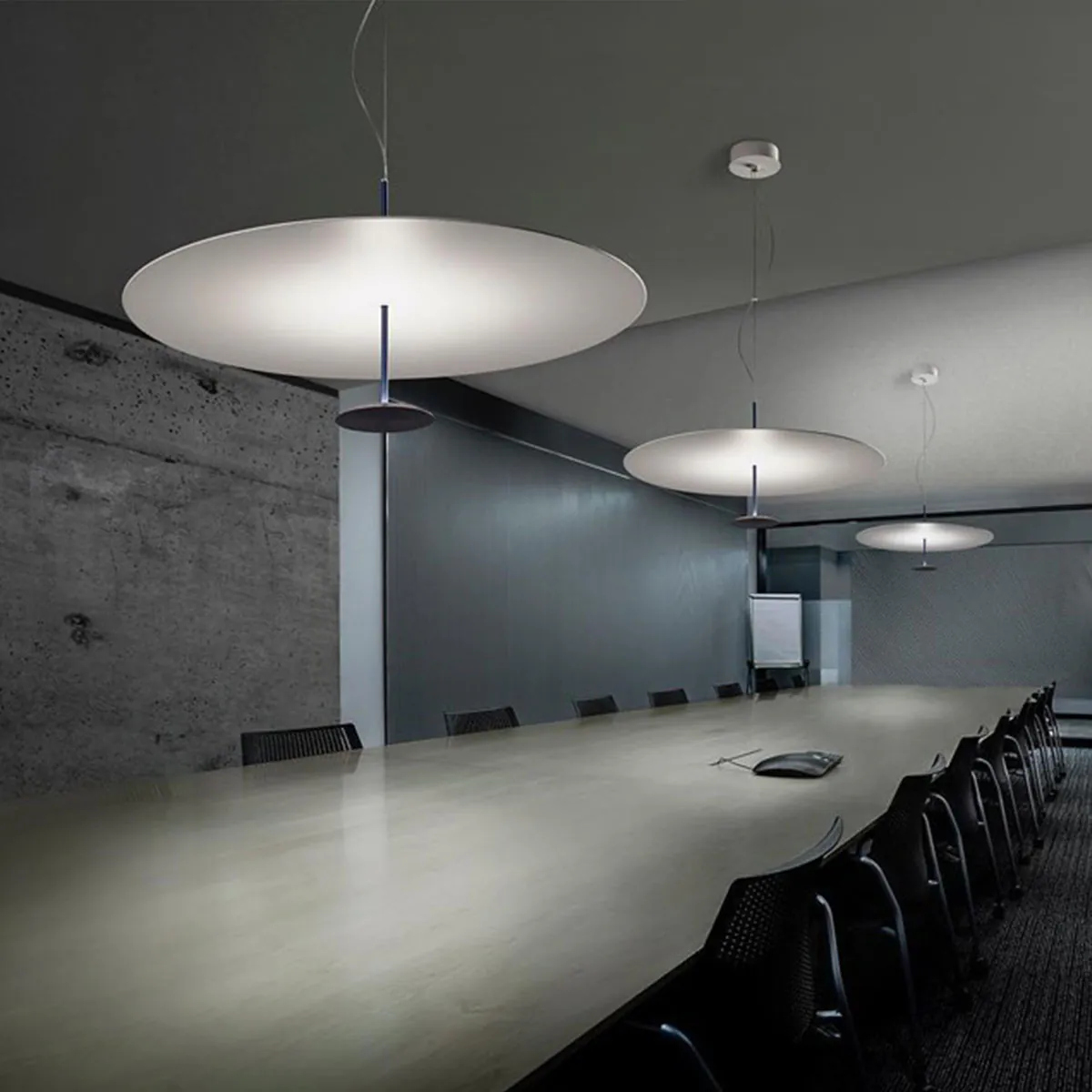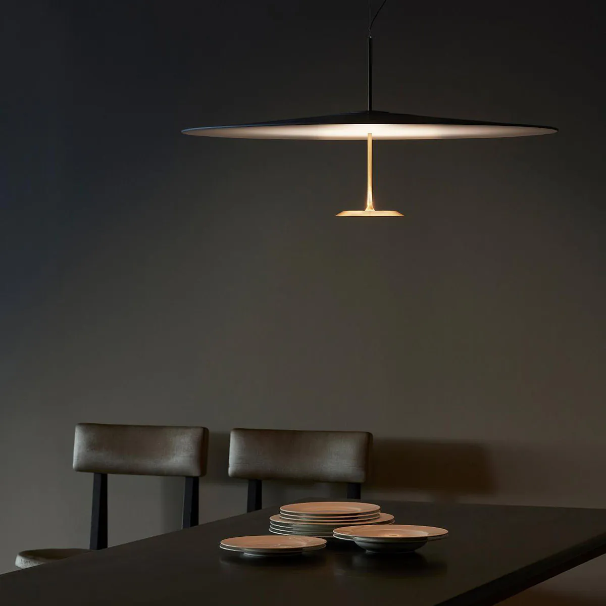 Dot ist eine Serie von Pendelleuchten, die von Foster + Partners entworfen wurde, um wie Lichtscheiben auszusehen. Ihr Design vereint formale Strenge mit modernster Beleuchtungstechnologie. Dot besteht aus zwei unterschiedlich großen parallelen Scheiben, die durch ein dünnen Metallrohr in ihren Zentren miteinander verbunden sind. Die untere, kleinere Scheibe besteht aus gedrehtem Aluminium und enthält einen LED-Ring, der optisch so konstruiert ist, dass er eine hohe Menge Licht auf die obere Scheibe, den Diffusor aus lackiertem Aluminium, wirft. Die leistungsstarke Lichtquelle erzeugt eine Menge Wärme, die die untere Scheibe nicht allein ableiten könnte. Dieses Problem wurde gelöst, indem ein spezieller Wärmeableiter aus der Luft- und Raumfahrtindustrie in das dünne Rohr zwischen den Scheiben platziert wurde. Seine Funktion besteht darin, den LED-Schaltkreis thermisch mit einem Wärmeableiter zu verbinden, der sich in der oberen Scheibe befindet. Beim Einschalten erscheint Dot als dünnere, leichtgewichtige Scheibe, die scheinbar in der Luft schwebt und eine umhüllende Lichtflut ohne Schatten erzeugt.