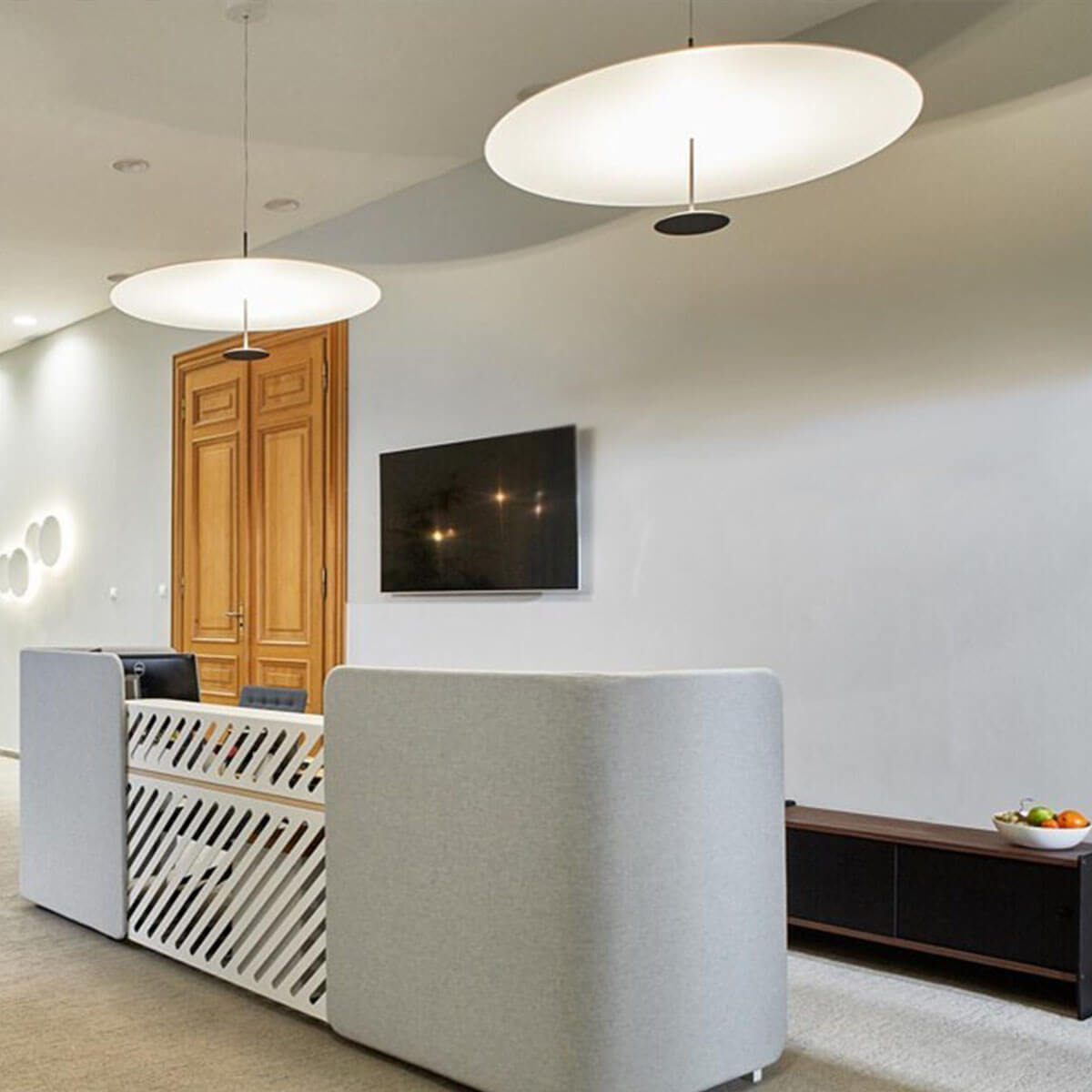 Dot ist eine Serie von Pendelleuchten, die von Foster + Partners entworfen wurde, um wie Lichtscheiben auszusehen. Ihr Design vereint formale Strenge mit modernster Beleuchtungstechnologie. Dot besteht aus zwei unterschiedlich großen parallelen Scheiben, die durch ein dünnen Metallrohr in ihren Zentren miteinander verbunden sind. Die untere, kleinere Scheibe besteht aus gedrehtem Aluminium und enthält einen LED-Ring, der optisch so konstruiert ist, dass er eine hohe Menge Licht auf die obere Scheibe, den Diffusor aus lackiertem Aluminium, wirft. Die leistungsstarke Lichtquelle erzeugt eine Menge Wärme, die die untere Scheibe nicht allein ableiten könnte. Dieses Problem wurde gelöst, indem ein spezieller Wärmeableiter aus der Luft- und Raumfahrtindustrie in das dünne Rohr zwischen den Scheiben platziert wurde. Seine Funktion besteht darin, den LED-Schaltkreis thermisch mit einem Wärmeableiter zu verbinden, der sich in der oberen Scheibe befindet. Beim Einschalten erscheint Dot als dünnere, leichtgewichtige Scheibe, die scheinbar in der Luft schwebt und eine umhüllende Lichtflut ohne Schatten erzeugt.