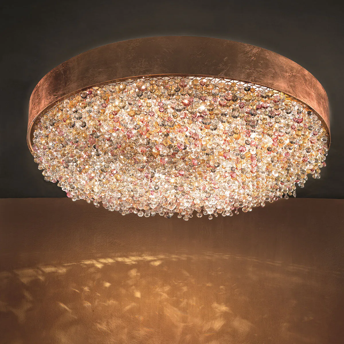 Ein Designjuwel, das aus einer Synthese aus Erfahrung und Kreativität entstanden ist. Vor mehr als einem Jahrzehnt vom kreativen Atelier von Masiero entworfen, vereint Olà den Kontrast zwischen einem schlichten Metallrahmen und einer luxuriösen Kaskade von Anhängern und ist zu einem Symbol für Masiero geworden.