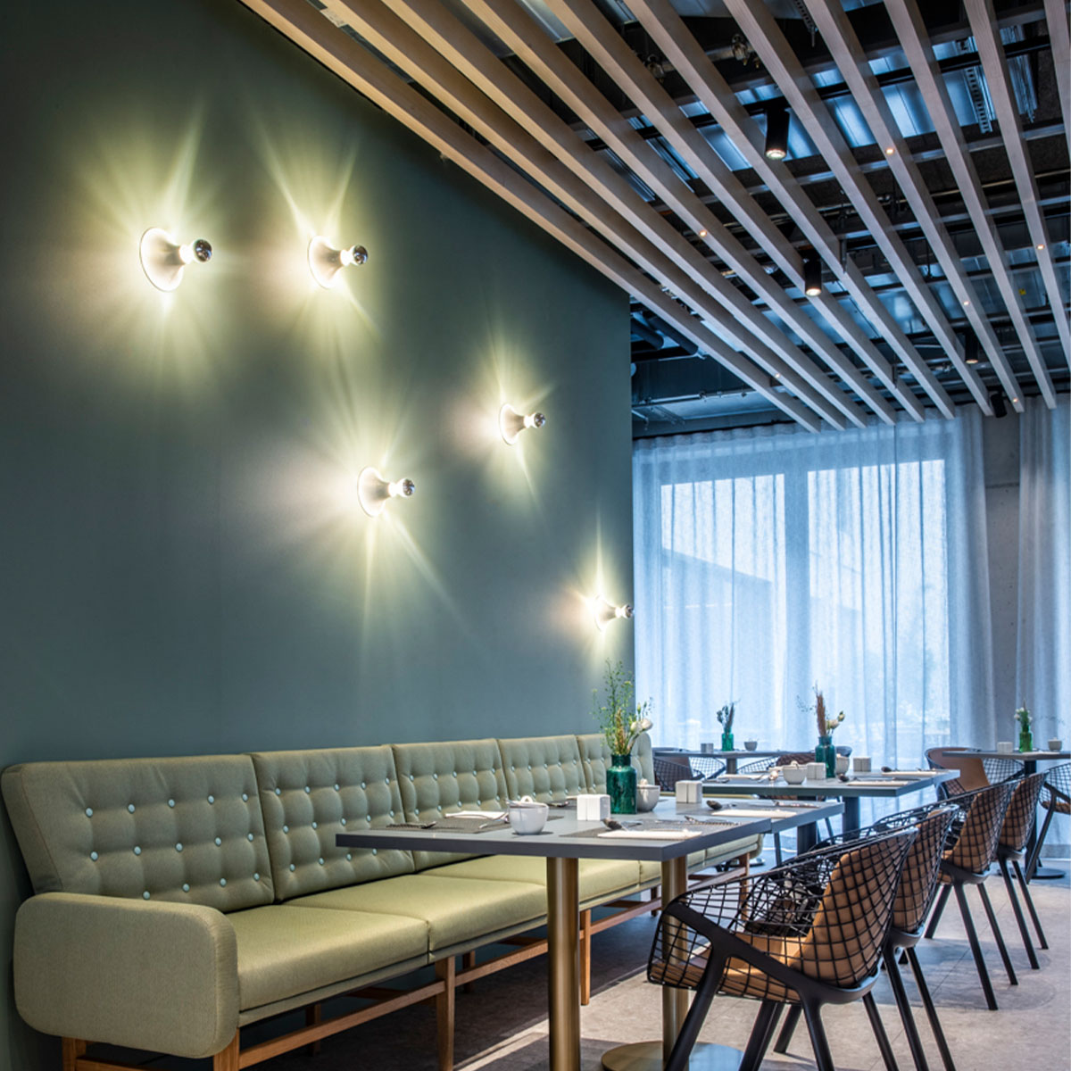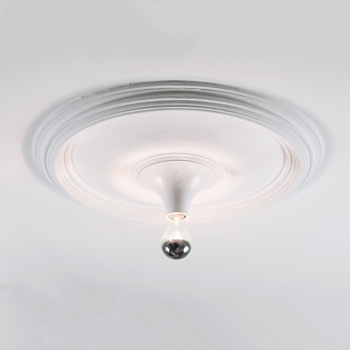 Alles Gute kommt von oben – in diesem Fall von der Deckenleuchte "etna", erhältlich in verschiedenen RAL-Farben, verchromt, blattversilbert/-vergoldet, in Kupfer oder Messing. Diese Leuchte ist wie ein Vulkan geformt, und das Leuchtmittel scheint beinahe aus der Fassung zu strömen. Die geschwungenen Linien bringen das Zusammenspiel von Gehäuse und Leuchtmittel auf den Punkt.