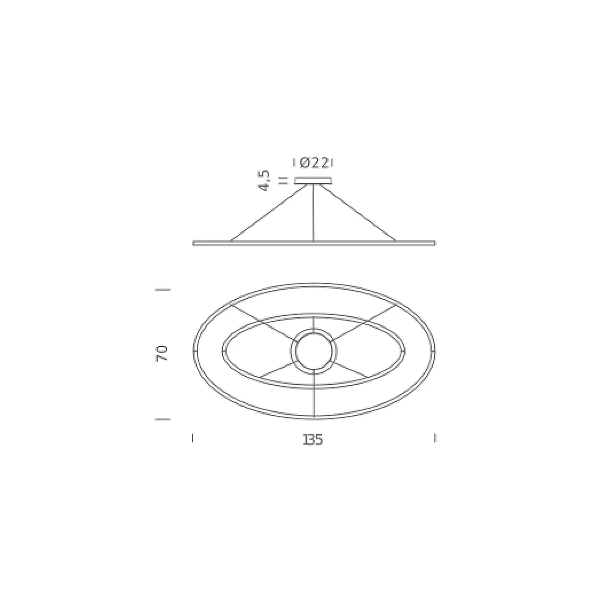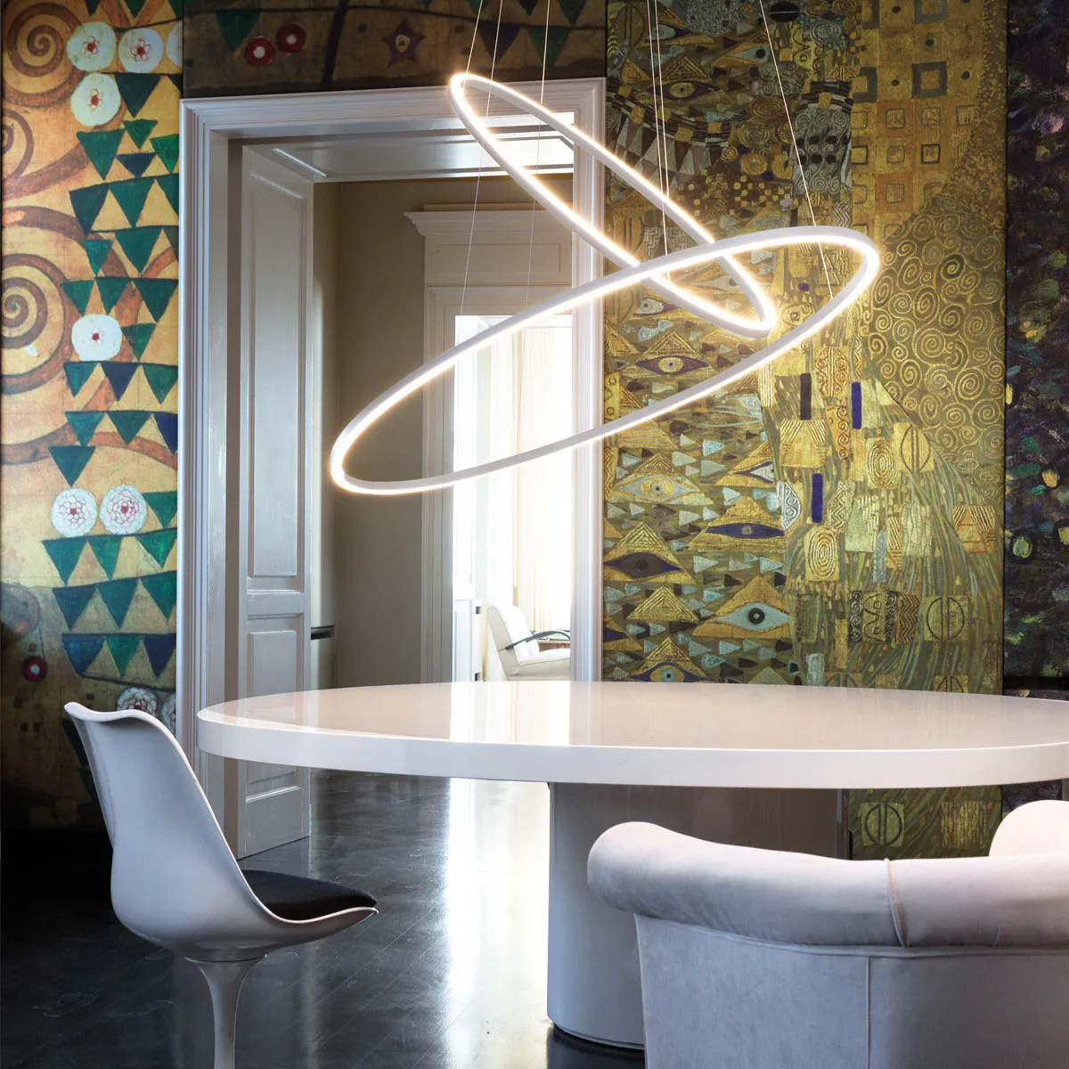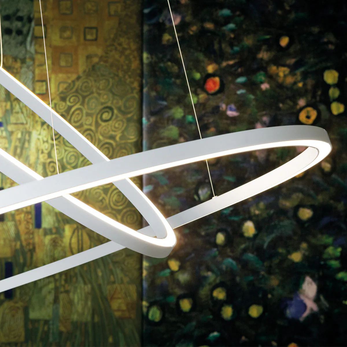 Aus stranggepresstem Aluminium in verschiedenen Ausführungen: matt lackiert in den Ausführungen weiß, schwarz und gold, naturpoliert und goldpoliert eloxiert. Ausgestattet mit einem opalen Diffusor. Ellisse Double von Nemo besteht aus zwei elliptischen Aluminiumringen mit Methacrylat-Diffusoren. Der kleinere Ring sorgt für diffuses Uplight, und der größere für diffuses Downlight. Dimmbar 1-10V.