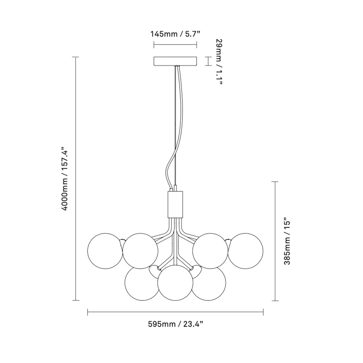 | Abmessungen: | Ø: 59,5 cm, H: 38,5 cm, Baldachin Ø: 14,5 cm, H: 2,9 cm, Pendelhöhe max: 400 cm |