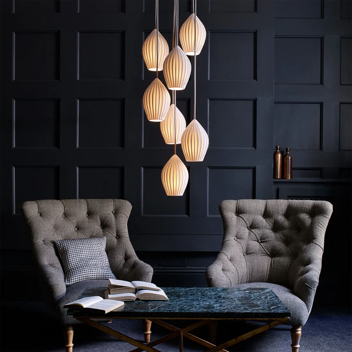 Die Original BTC Fin Leuchtenschirme zeichnen sich durch ihre sanften Schwingungen und feinen Rillen aus, wodurch jeder Schirm für sich bereits eine bemerkenswerte Erscheinung darstellt. Als mehrflammige Cluster-Pendelleuchte arrangiert, entfaltet das Design jedoch eine noch eindrucksvollere Wirkung. Diese Leuchten sind speziell für Räume mit hohen Decken konzipiert, wie beispielsweise Treppenaufgänge oder Eingangsbereiche, und verleihen jedem Interieur Flair und stimmungsvolles Licht. Die Varianten mit drei oder fünf Leuchten eignen sich auch hervorragend über einer Kücheninsel oder einem Esstisch. Jeder Leuchtenschirm der Original BTC Fin Pendelleuchten wird von Hand in England aus feinstem Bone China Porzellan gefertigt und verleiht dank einer sanften Glasur einen zarten Schimmer.