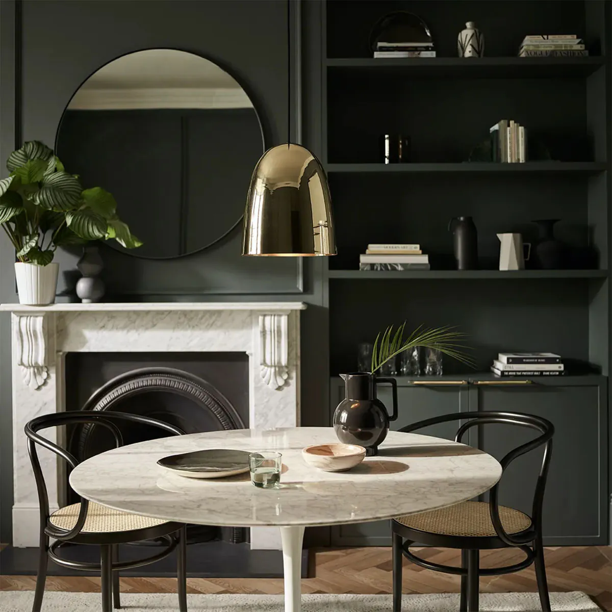 Die Schirme der Original BTC Stanley Pendelleuchten werden von Hand in einer Metallwerkstatt hergestellt. Dabei wird eine Metallplatte an einer Drehbank "gesponnen", um die längliche, runde Form zu erhalten. Sie sind in Messing, Nickel und Kupfer erhältlich, wobei die Oberfläche wahlweise gehämmert oder auf Hochglanz poliert wird. Die Original BTC Stanley Pendelleuchte ist in drei Größen erhältlich.