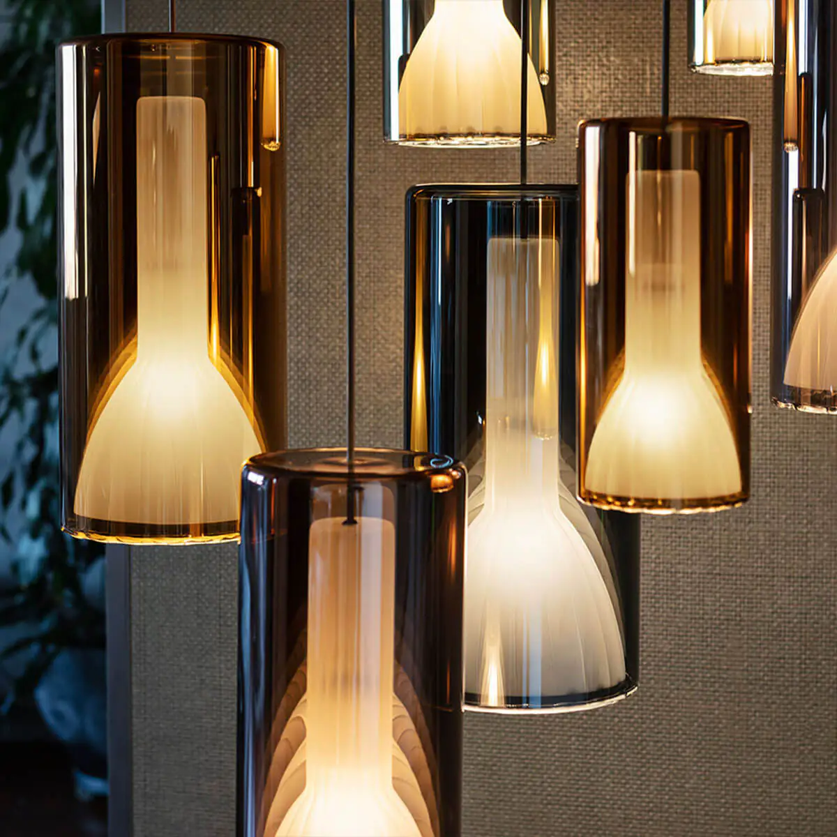 Lit ist ein vielseitiges Objekt, das sich mit dem Licht verändert. Im ausgeschalteten Zustand wirkt es wie eine schwebende Skulptur, eine minimalistische Röhre, die durch die Reflexionen auf dem Glas kostbar erscheint. Sobald sie eingeschaltet ist, offenbart die Lampe eine leuchtende, warme und sanfte Seele.