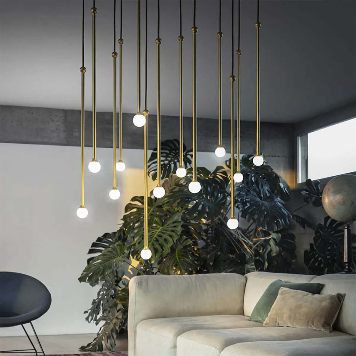 Zarte Stiele in edlen metallischen Ausführungen erzeugen suggestive Lichtharmonien. Storm ist in drei Größen erhältlich und kann einzeln verwendet werden, ist jedoch dafür konzipiert, in Gruppen sowohl in öffentlichen Räumen als auch zu Hause eingesetzt zu werden.