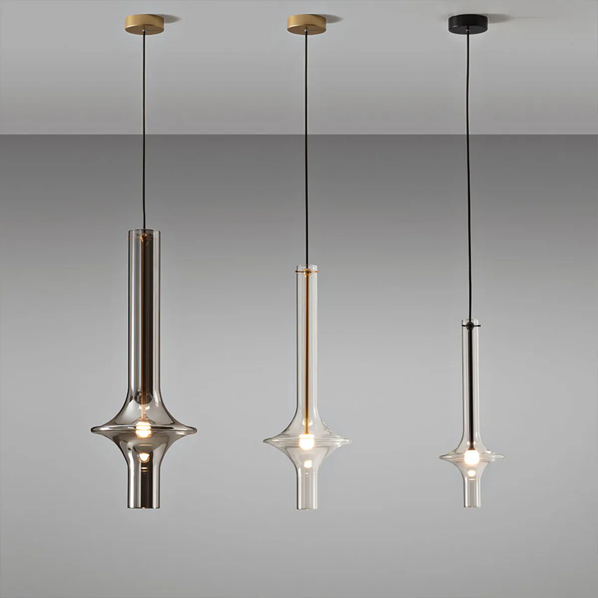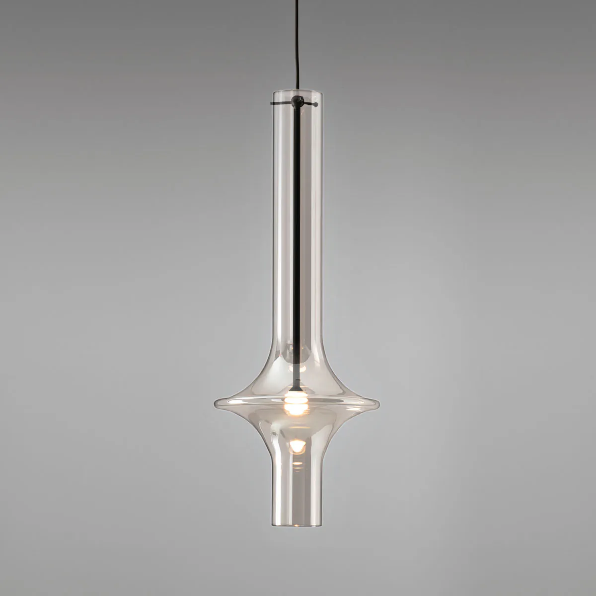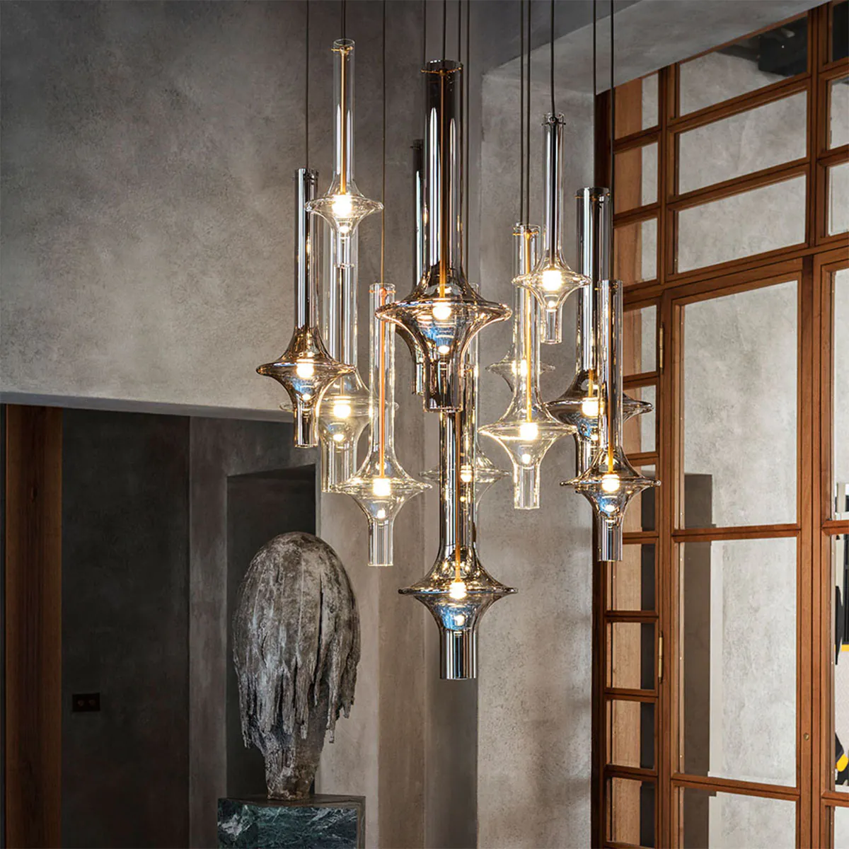 Die Kombination mehrerer Wonder-Lampen in verschiedenen Dimensionen, Ausführungen und Höhen ist beeindruckend, ebenso wie die leuchtende Schönheit des Borosilikatglases, aus dem jeder einzelne Stab gefertigt ist, in transparenter oder rauchiger Ausführung.
