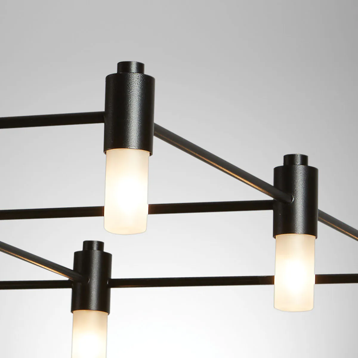 Modulare Hängelampe aus verschweißten und pulverbeschichteten Stahlrohren. Die möglichen Konfigurationen sind zahlreich und bilden ein System aus leuchtenden Gittern. Die Struktur besteht aus verschweißten und pulverbeschichteten Stahlrohren. Das Licht wird durch mattierte zylindrische Gläser verteilt.
